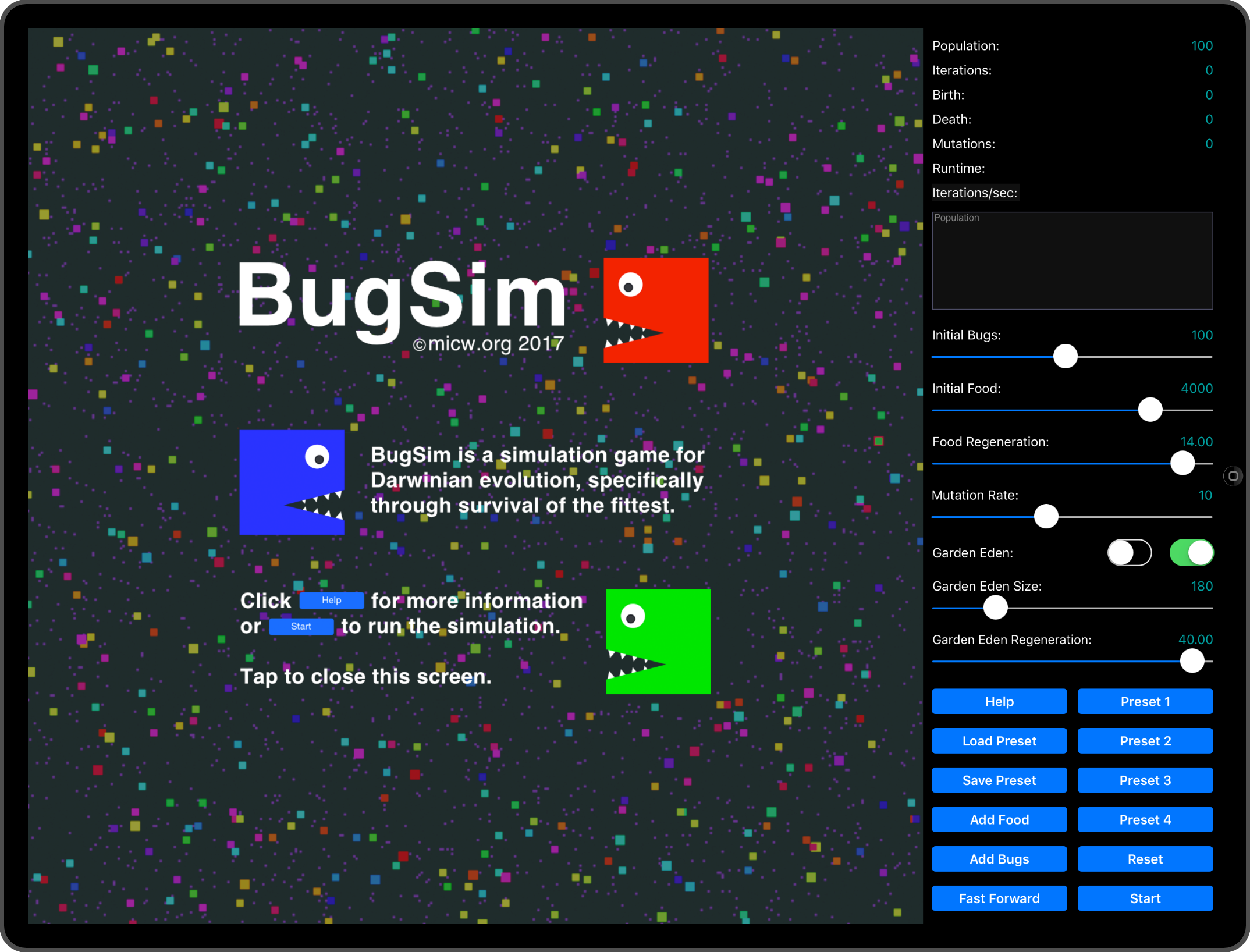 Bugs is a simulation game for Darwinian evolution, specifically through survival of the fittest.